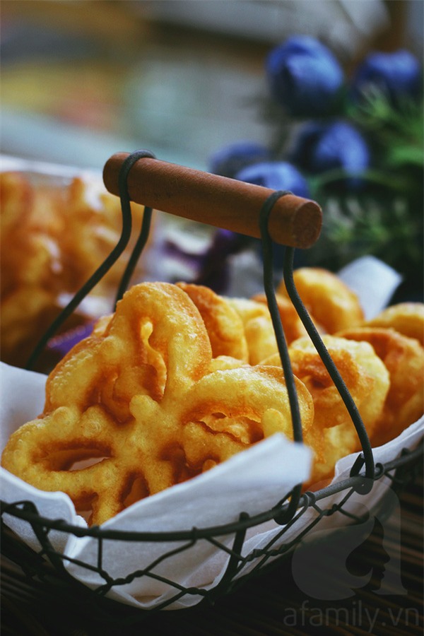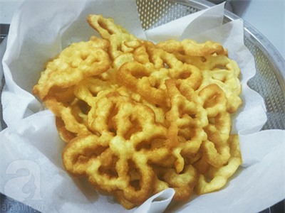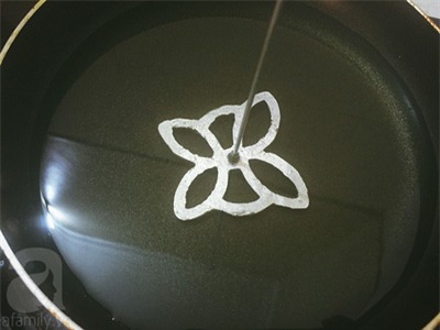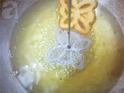 ![]() Nhanh tay nhúng vào dầu đang sôi, lưu ý vặn bếp cực nhỏ vì bánh rất dễ cháy. Xoay xoay nhẹ nhẹ để phần bánh từ từ rời ra khỏi khuôn. |