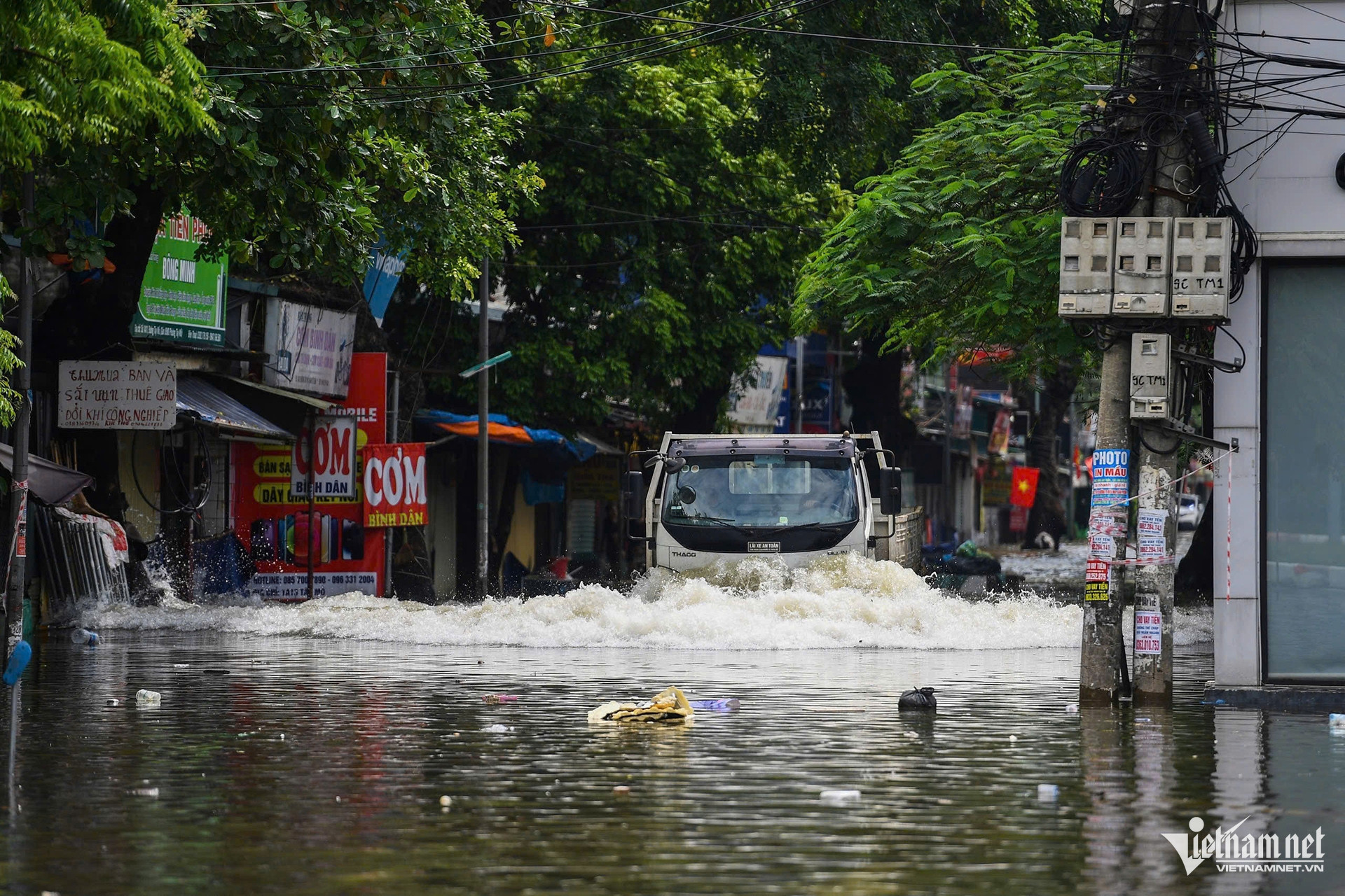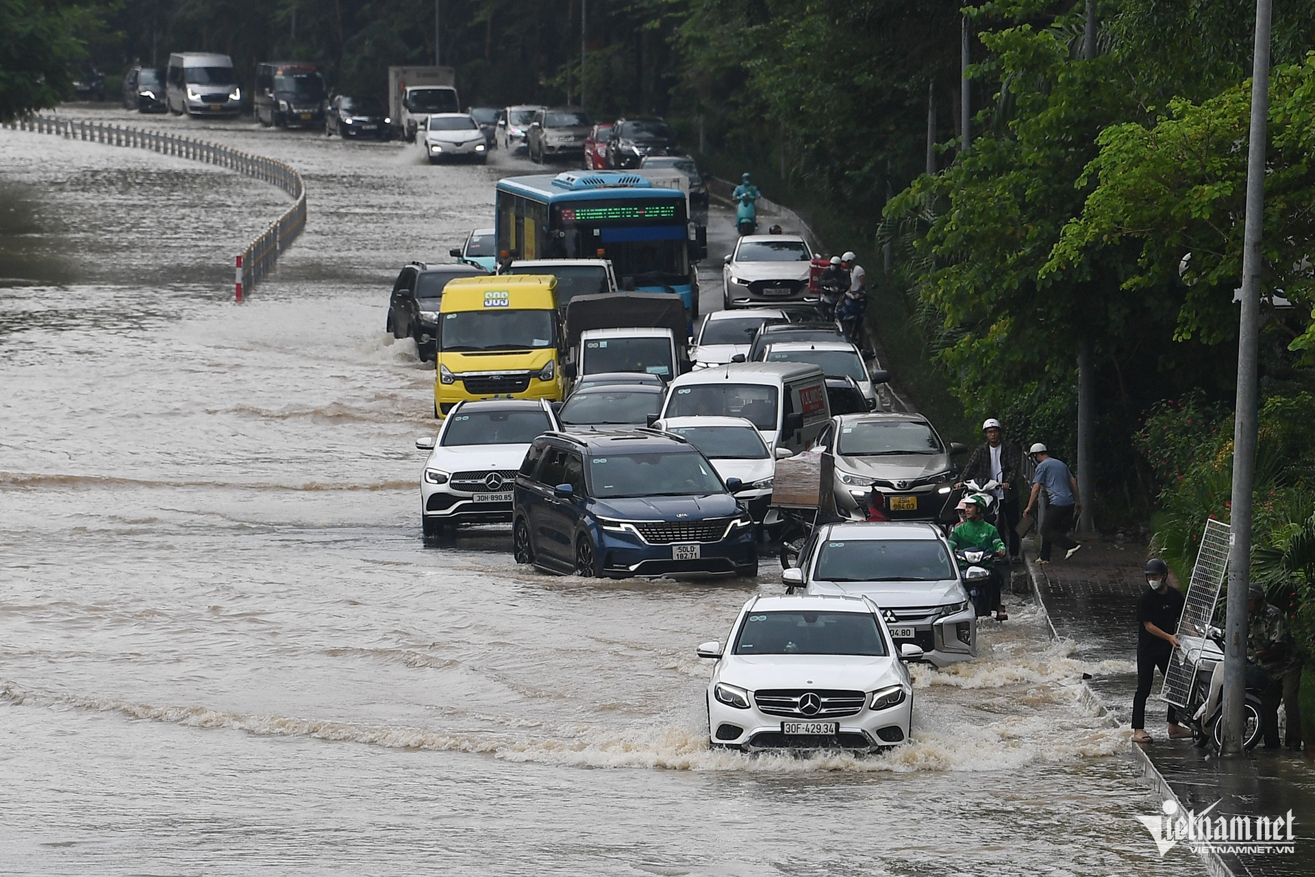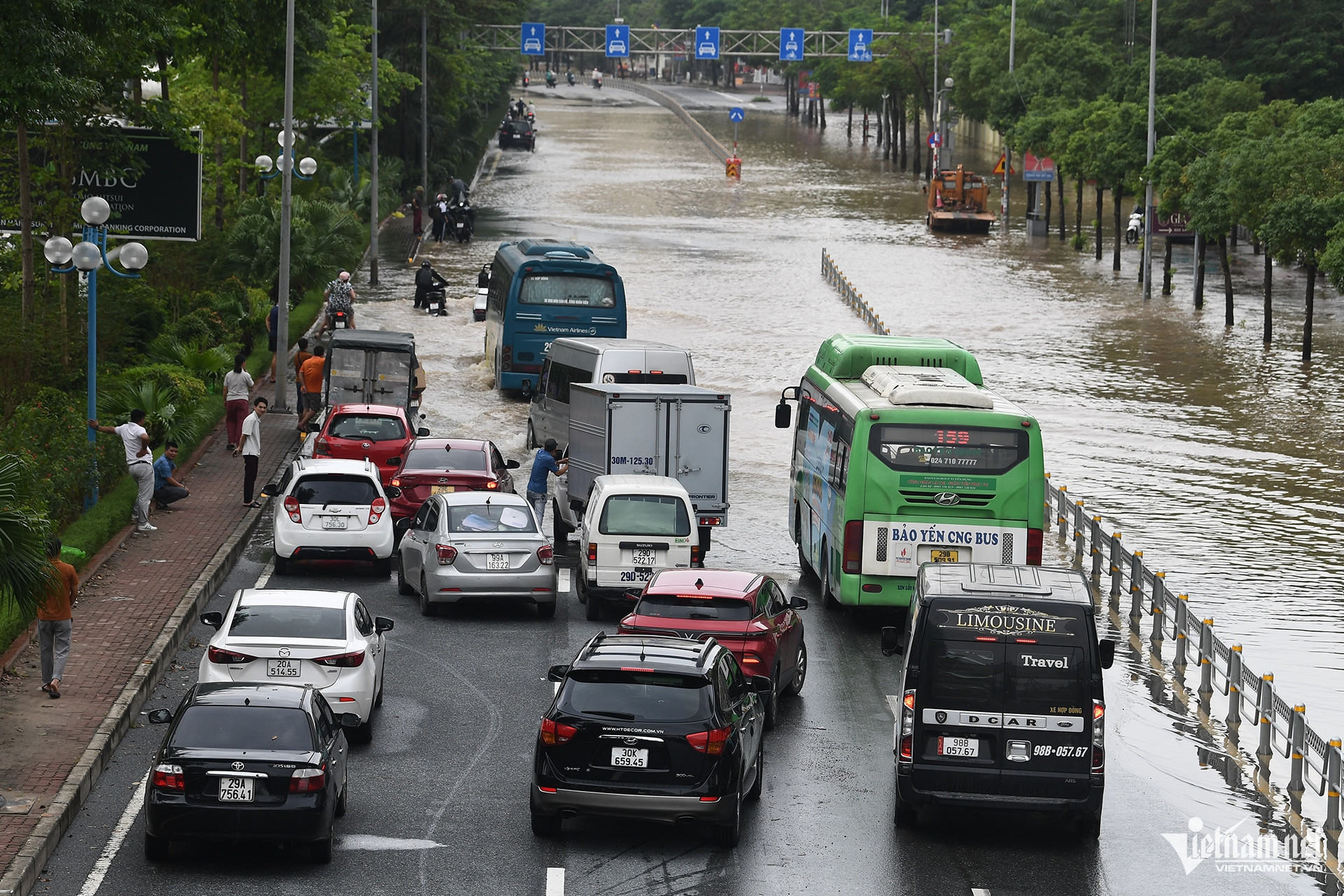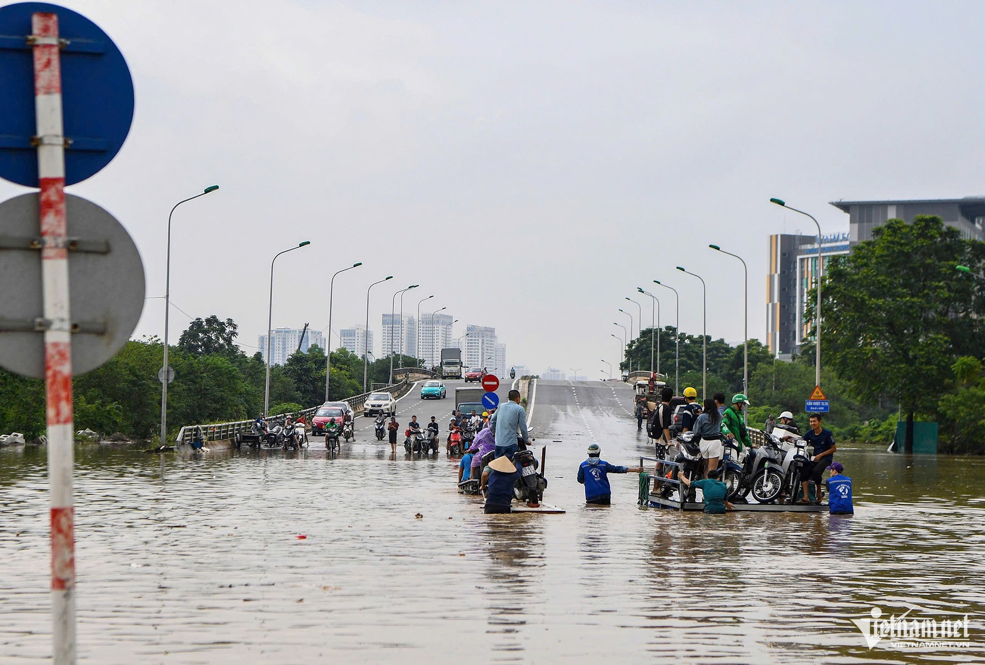 Đường gom đại lộ Thăng Long hướng từ trung tâm Thủ đô đi các xã ngoại thành vẫn ngập sâu hơn 1m. Các phương tiện không thể di chuyển qua đây.