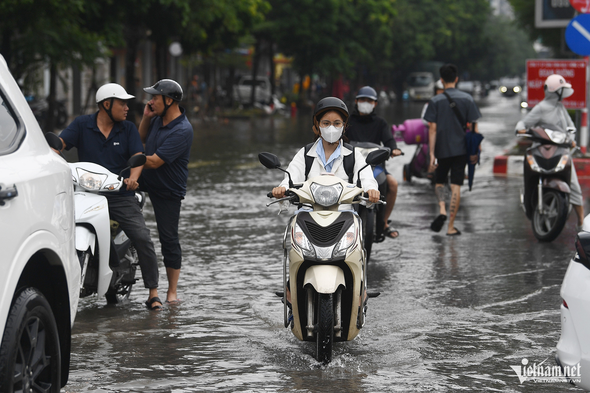 Một số công nhân đến nơi làm việc nhưng do xung quanh vẫn bị ngập đành quay xe về nhà.
