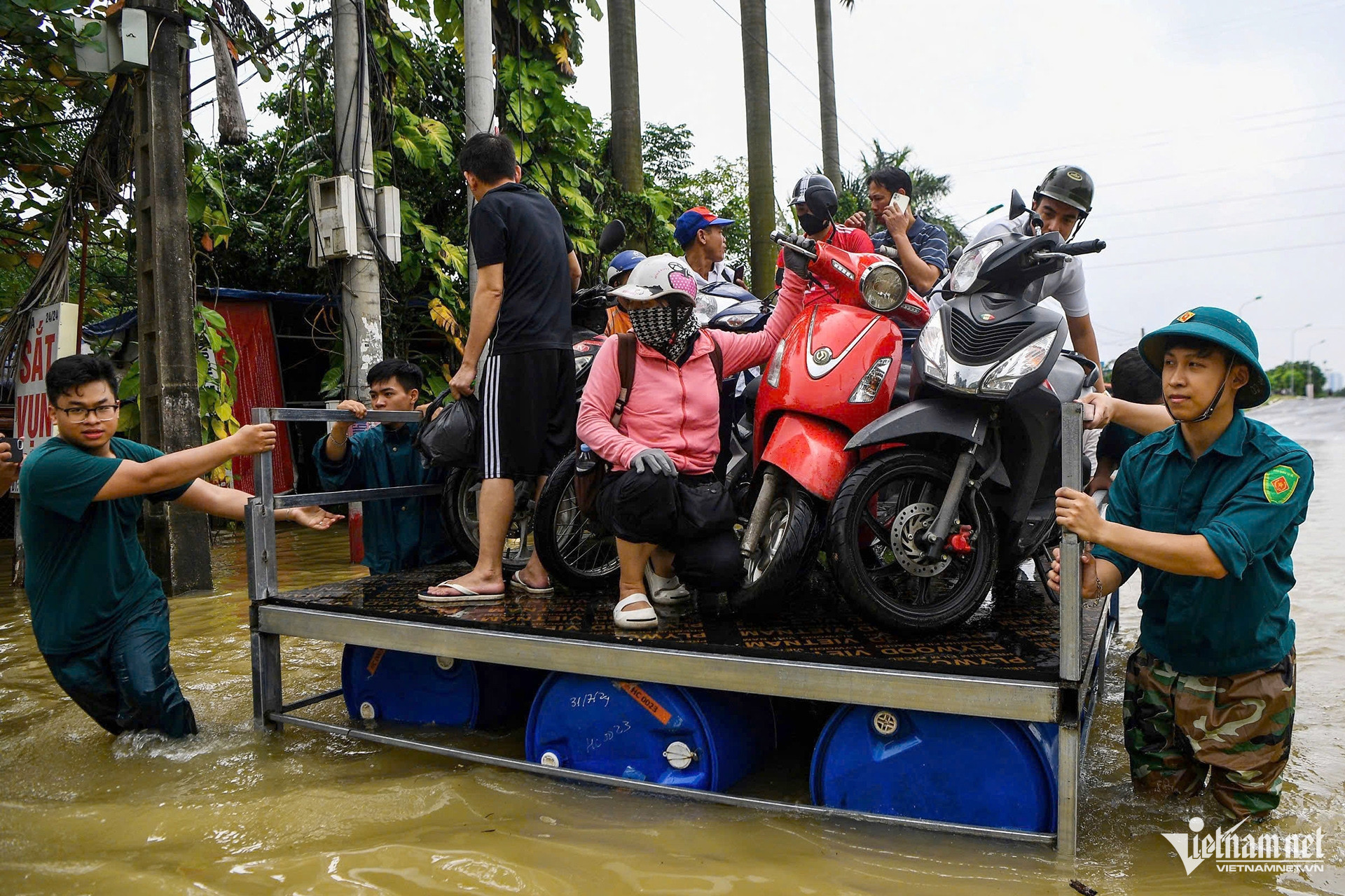 Lực lượng dân quân tự vệ lắp ráp phương tiện nổi hỗ trợ người dân di chuyển qua khu vực cầu Ngà, phường Xuân Phương.