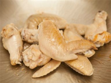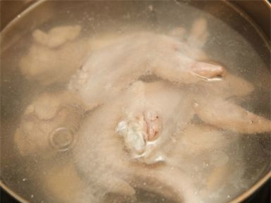 Bắc nồi nước lên bếp, khi nước sôi thì cho cánh gà vào luộc sơ khoảng 30-60 giây thì vớt ra, xả lại với nước lạnh rồi để ráo.