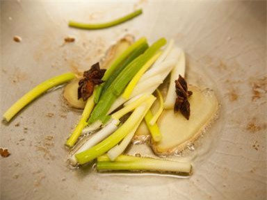 Bắc chảo lên bếp cùng chút dầu ăn sau đó cho gừng, cọng hành lá cắt khúc, hoa hồi vào phi thơm.