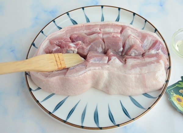 Quét một lớp mỏng dầu ăn lên trên bề mặt miếng thịt.
