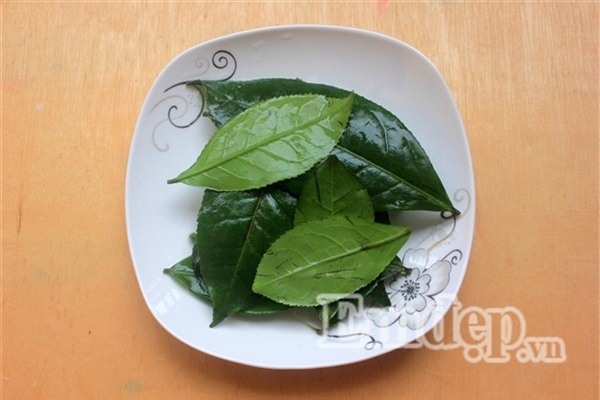 Bước 1: Lá trà xanh mua về rửa sạch, ngâm qua nước muối pha loãng khoảng 20 phút, lấy ra để cho ráo nước.