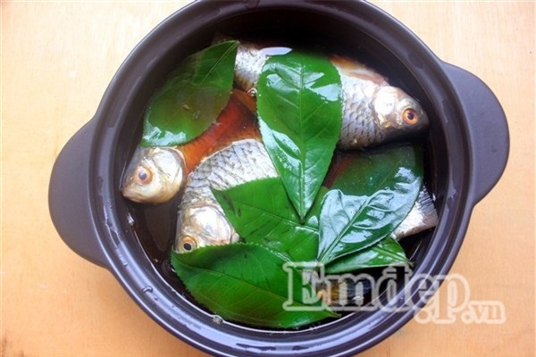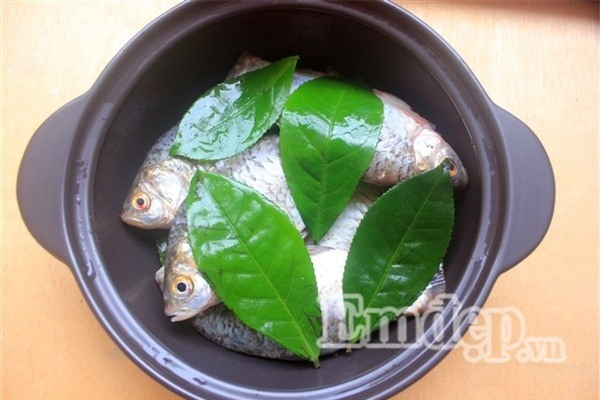 lá trà xanh phủ trên cá diếc. Cho nồi cá lên bếp đun vài phút cho đến