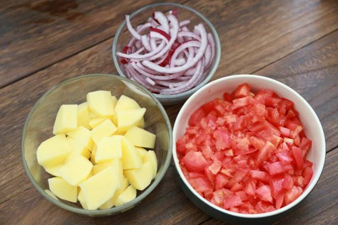 Cà chua rửa sạch, thái nhỏ. Khoai tây gọt vỏ, rửa sạch, cắt thành miếng vừa ăn; cắt hành tây thành miếng vừa ăn.