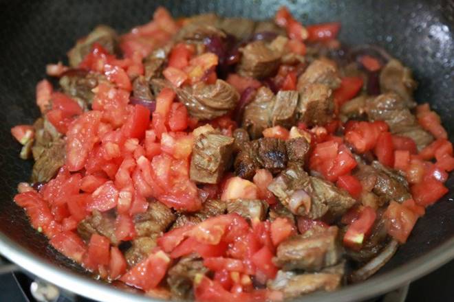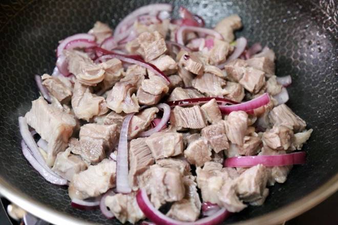 Cho một lượng dầu ăn thích hợp vào nồi, đun nóng dầu khoảng 50%, cho sau đó hành tây, tỏi băm vào phi thơm. Sau đó đổ thịt bò đã chần qua vào xào khoảng 1-2 phút.