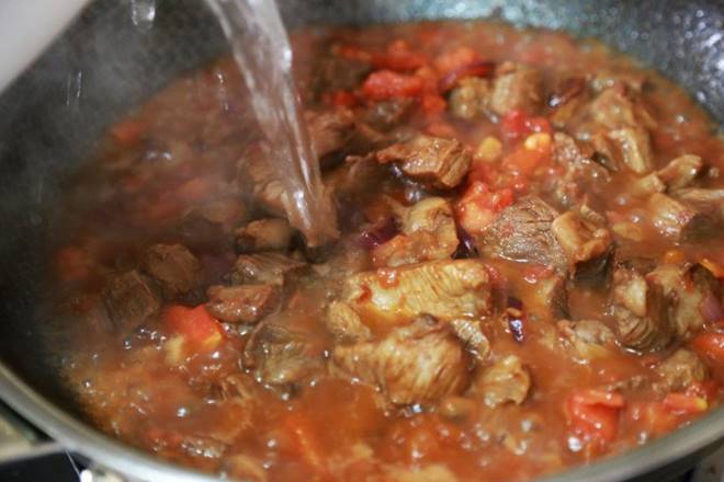 Đổ nước nóng chưa ngập mặt thịt bò vào nồi, sau đó cho đường phèn vào, vặn lửa nhỏ, đậy vung đun khoảng 30 phút. Lúc này không nên cho muối vào, nếu không thịt bò sẽ không nhanh mềm.