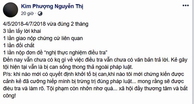 Chia sẻ trên trang cá nhân, người mẫu Kim Phượng thể hiện sự 'nóng ruột' về thông tin mới của vụ việc khi viết “ 4/5/2018-4/7/2018 vừa đúng 2 tháng, 3 lần lấy lời khai, 1 lần giao nộp chứng cứ liên quan, 1 lần đối chất, 1 lần nộp đơn đề “nghị thực nghiệm điều tra”. Đến nay vẫn chưa có kết quả gì về việc điều tra cũng như chưa có văn bản trả lời. Kẻ gây tội hiện tại vẫn là bị can sống thong thả ngoài pháp luật".
