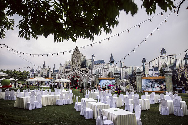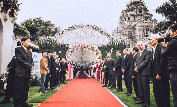 Đám cưới được tổ chức tại một khu đất trống rộng 5000m2 ở Đông Anh, Hà Nội. Đằng sau không gian sang trọng, tráng lệ ấy là cả một ekip làm việc không ngừng nghỉ suốt 50 ngày. Từ đào hào thoát nước, đầm đất bằng xe lu đến san phẳng bằng cát. Riêng quá trình trải cỏ mất gần 2 ngày với hơn 30 người thực hiện. Thế mới biết, để có được thời khắc hạnh phúc và đáng ghi nhớ nhất cuộc đời, cô dâu chú rể đã phải đầu tư thời gian và công sức thế nào.