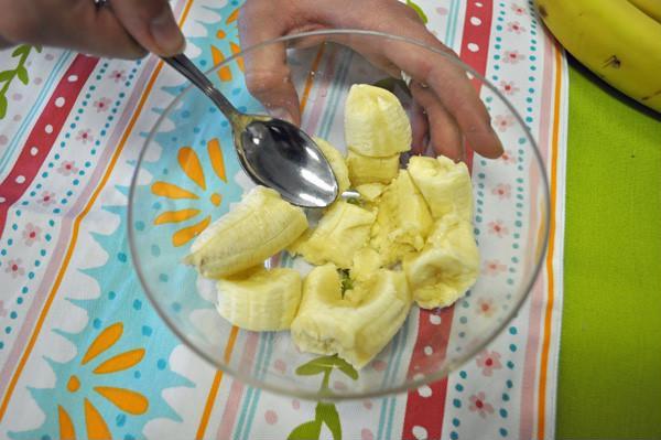 - Chuối sau khi mua về đem bóc bỏ vỏ ngoài, cắt thành khúc nhỏ rồi nghiền nhuyễn.