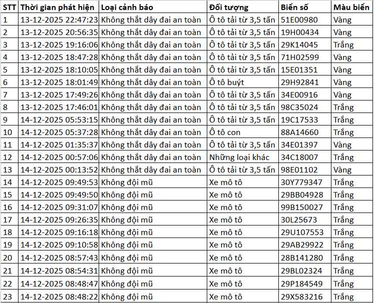 Còn tại Km20 cao tốc Nội Bài - Lào Cai, camera AI đã ghi nhận 14.231 phương tiện đi qua với vận tốc trung bình là 72 km/h. Đồng thời, phát hiện 13 trường hợp tài xế ô tô không thắt dây đai an toàn.