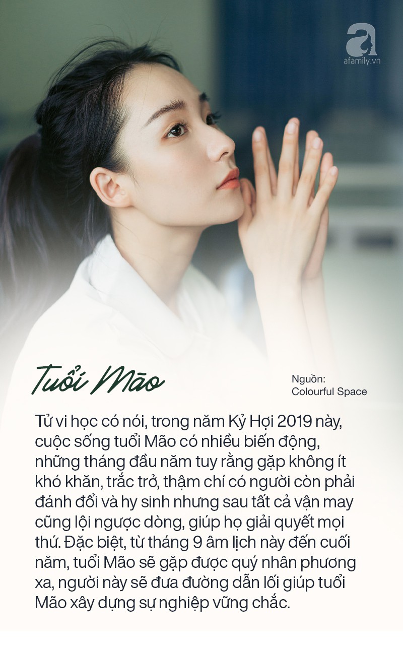 Tử vi học có nói, trong năm Kỷ Hợi 2019 này, cuộc sống tuổi Mão có nhiều biến động, những tháng đầu năm tuy rằng gặp không ít khó khăn, trắc trở, thậm chí có người còn phải đánh đổi và hy sinh nhưng sau tất cả vận may cũng lội ngược dòng, giúp họ giải quyết mọi thứ. Đặc biệt, từ tháng 9 âm lịch này đến cuối năm, tuổi Mão sẽ gặp được quý nhân phương xa, người này sẽ đưa đường dẫn lối giúp tuổi Mão xây dựng sự nghiệp vững chắc. Trước đây, họ từng nghĩ rằng mọi chuyện sẽ khó thực hiện, nhưng thời gian tới sẽ là cơ hội tốt để tuổi Mão đổi đời, chỉ cần nắm bắt đúng thời cơ thì việc tận hưởng cuộc sống vinh hoa phú quý chỉ trong tầm tay.