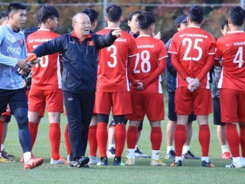 HLV Park Hang Seo và các tuyển thủ Việt Nam đã không thể tập tại sân cỏ do thời tiết Paju trở lạnh kèm gió rét. Ông quyết định cùng các tuyển thủ tập trong sân bóng futsal ở Trung tâm bóng đá quốc gia Paju, Hàn Quốc chiều 28/10. Ảnh: Nhân Văn.