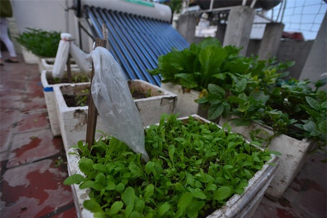 Trên mảnh đất 30 m2, bà Thu trồng hơn 20 loại rau gồm muống, khoai lang, đay... Các luống được chủ nhà đánh theo hàng thẳng tắp. Rau cải, mồng tơi, rau ngót Nhật và các loại rau thơm, gia vị (tía tô, mùi tàu, húng, canh giới, chanh, ớt ...) được trồng trong những hộp xốp bà Thu xin của các hàng hoa quả.