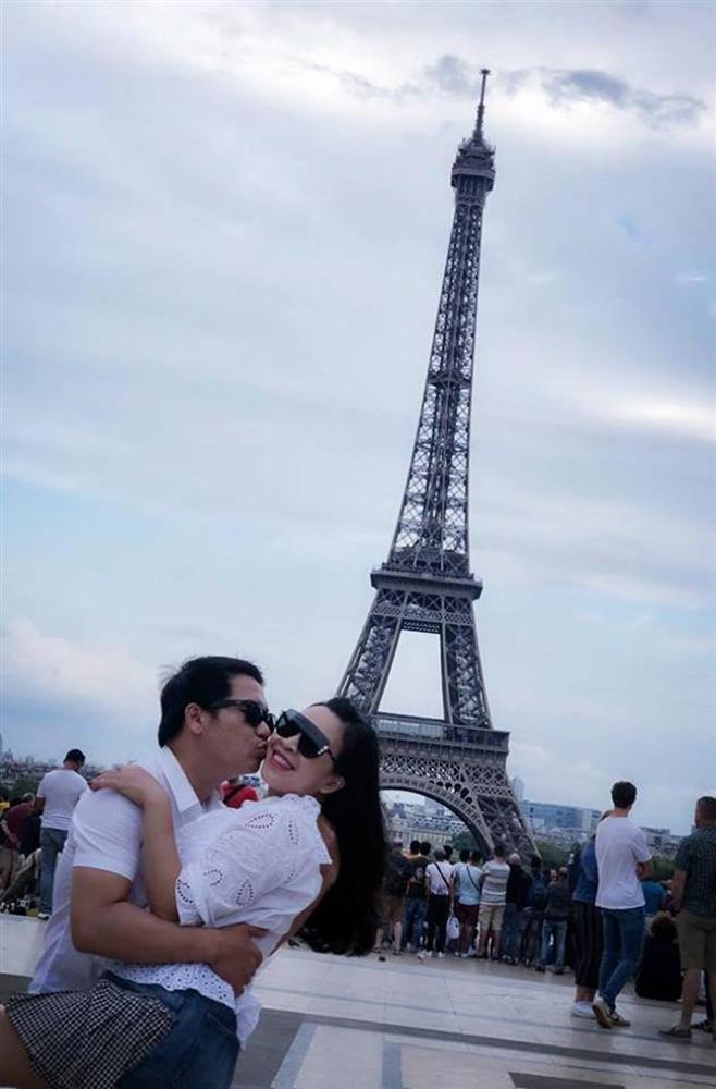 Hình ảnh ca sĩ Trọng Tấn ôm hôn vợ tình tứ dưới chân tháp Eiffel được bà xã đăng trên trang cá nhân khiến nhiều người thích thú.