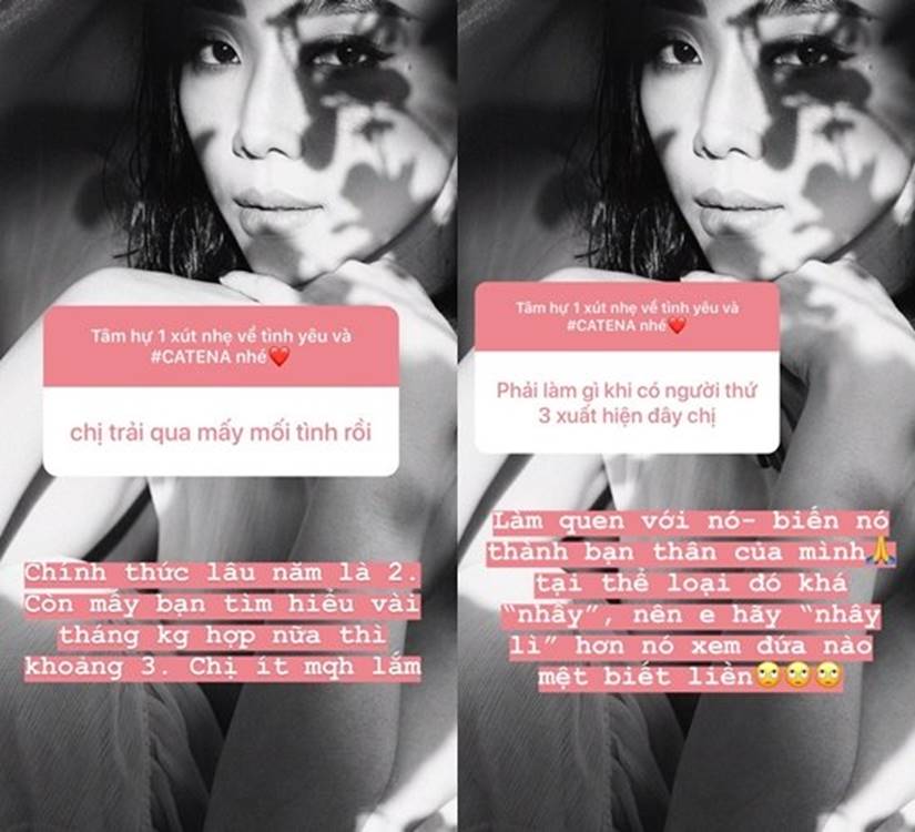 Trả lời người hâm mộ, Tóc Tiên cho biết cô đã trải qua 2 cuộc tình lâu năm và 3 mối tình chỉ diễn ra được vài tháng. Khi được hỏi: "Phải làm gì khi người thứ 3 xuất hiện?", Tóc Tiên hóm hỉnh nói: "Làm quen với nó, biến nó thành bạn thân của mình. Tại thể loại đó khá 'nhây' nên em hãy 'nhây lì' hơn nó, xem đứa nào mệt biết liền".