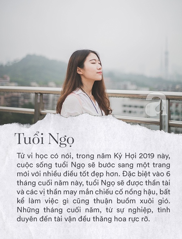 Tử vi học có nói, trong năm Kỷ Hợi 2019 này, cuộc sống tuổi Ngọ sẽ bước sang một trang mới với nhiều điều tốt đẹp hơn. Đặc biệt vào 6 tháng cuối năm này, tuổi Ngọ sẽ được thần tài và các vị thần may mắn chiếu cố nồng hậu, bất kể làm việc gì cũng thuận buồm xuôi gió. Những tháng cuối năm, từ sự nghiệp, tình duyên đến tài vận đều thăng hoa rực rỡ. Hơn nữa, thời điểm này tuổi Ngọ sẽ gặp được cơ hội tốt để đổi vận, chỉ cần biết nắm bắt thì cuộc sống vào những năm về sau không còn phải lo lắng, sầu muộn.