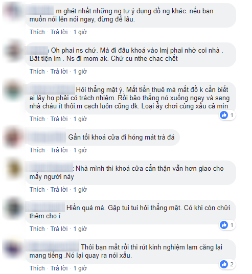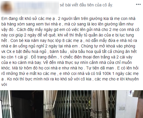 Về đến nhà thực sự nhìn cảnh nhà cửa chỉ muốn khóc. Mà từ hôm đó họ coi nhà em như nhà họ. Tự tiện dã man. Em có nên hỏi rõ những thứ em mất không các mẹ, em nhờ coi nhà và có trả 100k 1 ngày các mẹ ạ. Không nói thì bực mình nói ra khó khó xử với cô kia, các mẹ cho em lời khuyên với”.