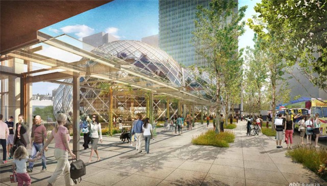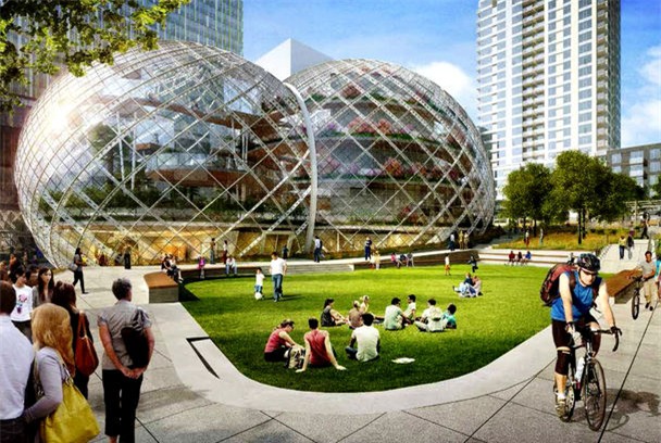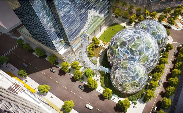 Nét độc đáo: Kiểu dáng các tòa nhà tại trụ sở của Amazon không khỏi khiến chúng ta liên tưởng đến các nhà kính thực vật khổng lồ. Quan điểm này càng được củng cố thêm khi cây xanh xuất hiện tại mọi nơi trong khuôn viên của trụ sở. Người đại diện của Amazon cho biết họ muốn xây dựng một môi trường làm việc thoáng mát, nhằm duy trì sức khỏe của nhân viên và tạo cảm giác gần gũi với thiên nhiên.