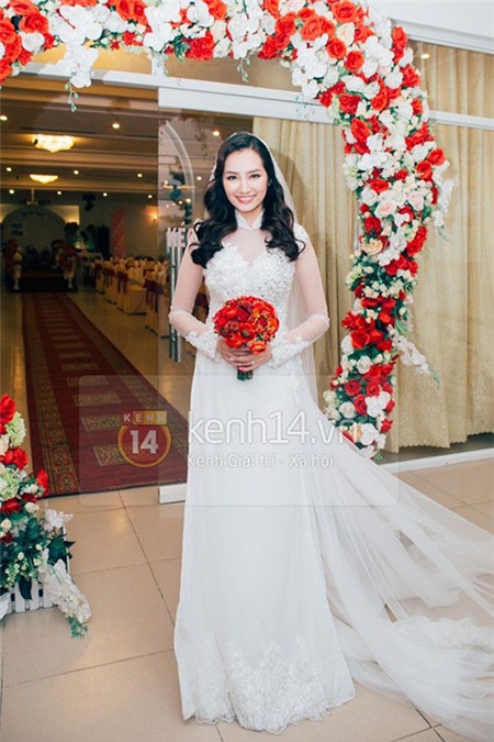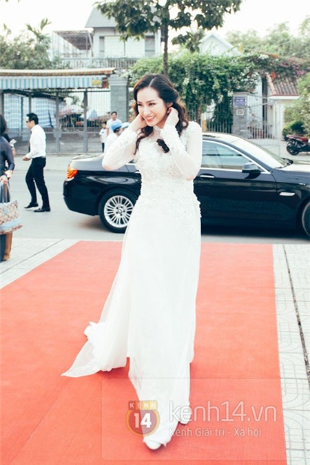 dâu Trúc Diễm xuất hiện trong chiếc áo dài trắng được thiết kế cầu kỳ,