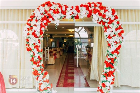 Cổng chào được kết hoa với tông màu trắng - đỏ |
