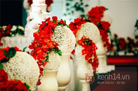 gian buổi tiệc được trang trí với màu sắc chủ đạo là trắng và đỏ. Sân