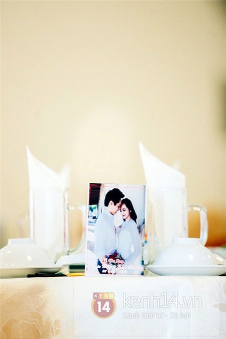 Ảnh cưới của cô dâu chú rể bày ở bàn tiệc |