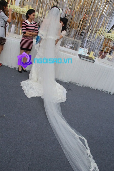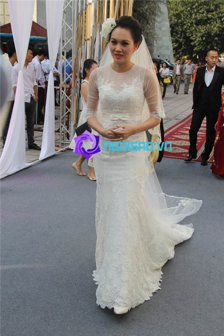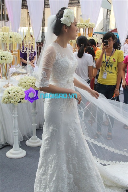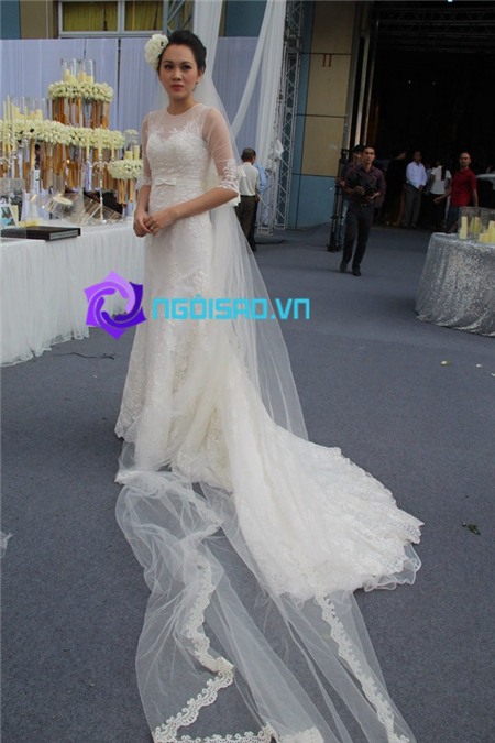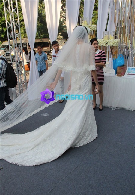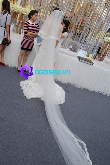 Chiều nay, cả cô dâu, chú rể đã đều xuất hiện trong lễ cưới để chuẩn bị những nghi lễ như đón khách, tiêp rượu và làm lễ trên sân khấu. Trước đó, cùng ngắm nhìn cô dâu Ngoc Thạch đẹp rạng rỡ trong chiếc váy cưới trắng thướt tha: