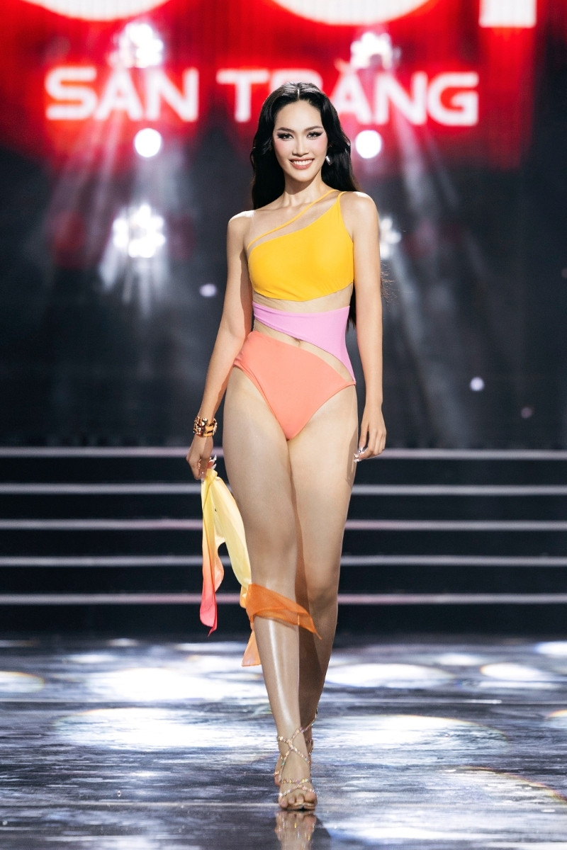 Trong phần thi bikini căng thẳng, 20 thí sinh bước lên sàn diễn với sự tự tin đầy quyến rũ, thể hiện vóc dáng và thần thái rạng rỡ dưới ánh đèn sân khấu. Phần thi này không chỉ khẳng định vẻ đẹp hình thể mà còn thể hiện sự tự tin, bản lĩnh của những người đẹp trong hành trình chinh phục vương miện danh giá. Mỗi thí sinh được MC giới thiệu bằng tên, số báo danh và quê hương, tạo nên những khoảnh khắc đầy cảm xúc.