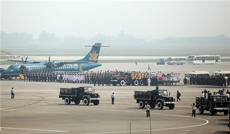 - Linh cữu Đại tướng đang được chuyển từ chuyên cơ đặc biệt sang Linh xa tại sân bay.