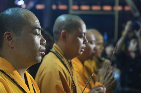 Các phật tử đón Đại tướng với đèn hoa đăng trên tay. Ảnh: Lê Hiếu