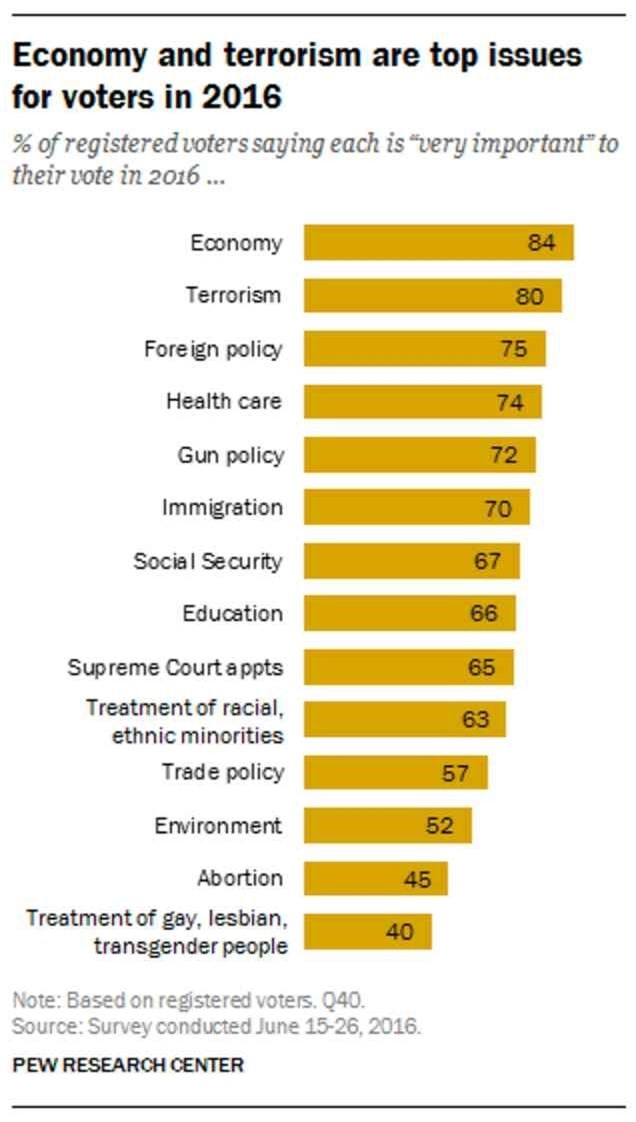 Thăm dò của Trung tâm Nghiên cứu Pew cho thấy các chủ đề quan tâm hàng đầu của cử tri Mỹ trong năm 2016 là kinh tế và khủng bố. Ảnh: Guardian |