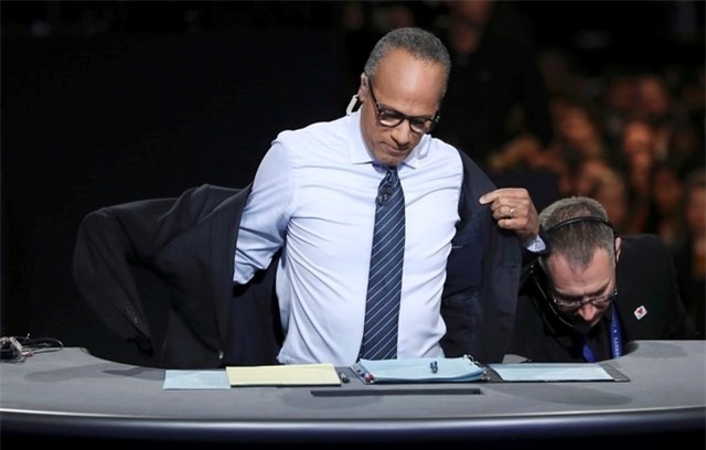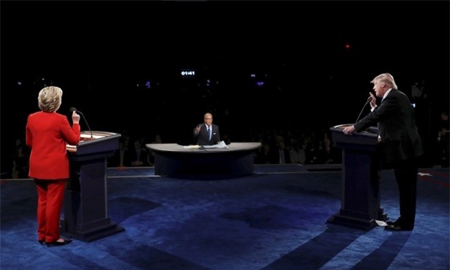 | Người dẫn chương trình Lester Holt "nóng" trước các tranh luận nảy lửa của ông Trump và bà Clinton, trong khi người dân chăm chú theo dõi phát biểu của hai vị ứng viên tổng thống. Ảnh: Reuters |