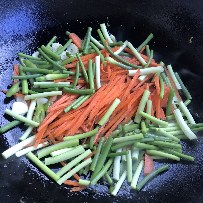 Cà rốt bào vỏ thái sợi; ngồng tỏi rửa sạch cắt khúc; ớt xanh thái sợi; tỏi băm nhỏ.