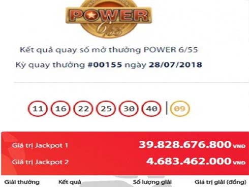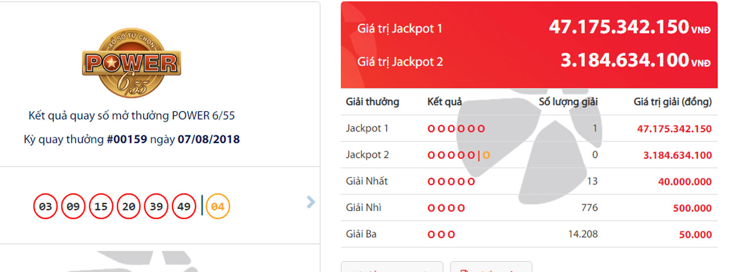 Trong kỳ quay thưởng lần thứ 159 của loại hình xổ số Power 6/55, Vietlott xác định giá trị giải thưởng Jackpot 2 là hơn 3,1 tỷ đồng nhưng chưa có người chơi may mắn nào trúng giải thưởng này. Tuy không tìm ra được chủ nhân giải Jackpot 2 nhưng Vietlott cũng đã tìm ra được chủ nhân giải Jackpot 1 trị giá hơn 47 tỷ đồng (chưa nộp thuế).