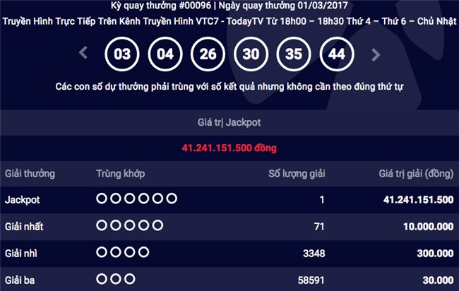 Theo thông báo của Công ty xổ số điện toán Việt Nam tối 1/3, giải Jackpot tiếp tục xuất hiện với dãy số may mắn ở kỳ quay lần thứ 96.Dãy số kỳ quay này là 03-04-26-30-35-44. Tổng giá trị giải thưởng đặc biệt Jackpot lần này là 41.241.151.500 đồng, chỉ kém giải Jackpot gần đây nhất tại kỳ quay 92 khoảng 350 triệu đồng.