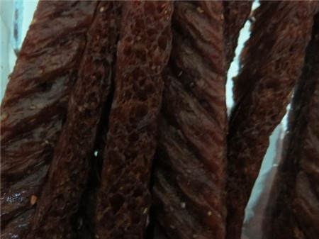 Sản phẩm có màu sắc khá giống thịt bò và ép miếng khá to, có thớ dọc. Kéo miếng “sườn bò” theo chiều dọc thì rất dai. Miếng sườn hổ không bị ép mỏng nên có thể thấy rõ các lỗ trên miếng "sườn” tựa như lỗ trên tấm xốp.