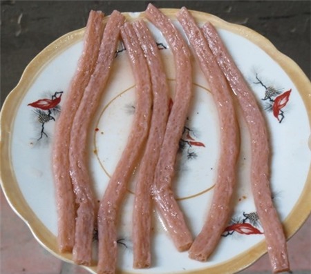 Miếng "sườn bò" ngâm trong nước tách ra thành thớ dọc và có màu nhờ nhờ. |