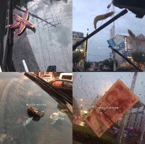 Thậm chí, trong cơn mưa đó có cả những tờ tiền 100 tệ bị gió cuốn mắc vào cần gạt nước trên xe ô tô.