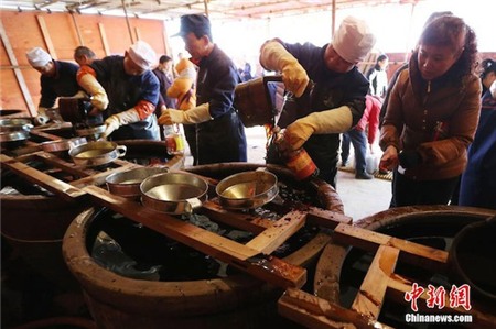 Hàng ngàn người đang xếp hàng đợi mua nước tương cổ truyền tại Trấn Giang, Giang Tô, Trung Quốc.