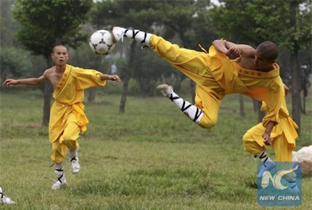 Học viên của Trường Võ thuật Thiếu Lâm Tagou trong một buổi tập bóng đá. Ảnh: Tân Hoa Xã |