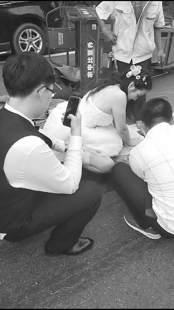 Người qua đường choáng váng khi nhìn thấy một người phụ nữ mặc váy cưới, chạy ngay đến hiện trường để hỗ trợ cứu người bị tai nạn giao thông ở miền bắc Trung Quốc.
