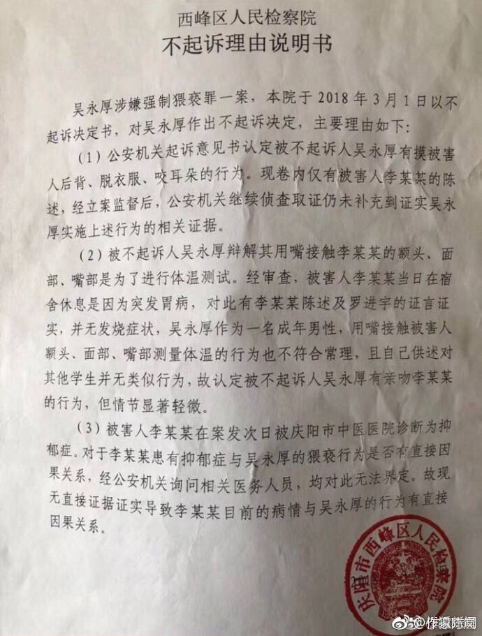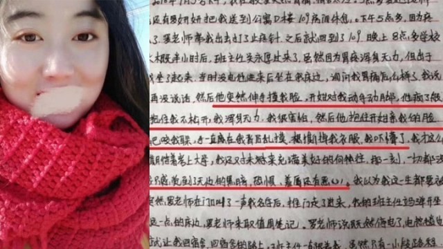 Trong thư Li để lị có viết khi còn là học sinh lớp 11, vào ngày 5/9/2016, cô đã đến phòng y tế của trường nghỉ ngơi sau cơn đau dạ dày dữ dội. Sau đó, giáo viên chủ nhiệm của Li, được xác định là họ Wu, đã đến kiểm tra và thừa cơ khống chế cưỡng hôn, đụng chạm và xé quần áo Li. Mắn mắn là một giáo viên khác tình cờ đi ngang qua khu vực này đã bắt gặp, Li được đưa trở về kí túc xá của mình.