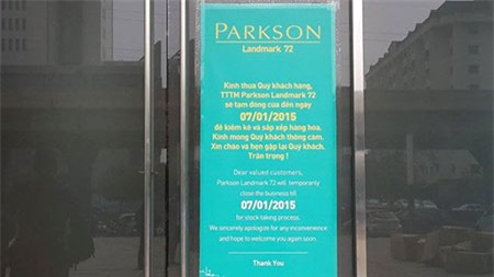 Sáng hôm nay, ngày 4/1, các đơn vị kinh doanh vẫn tiếp tục vận chuyển đồ dưới sự giám sát của đơn vị tòa nhà. Ngay phía cửa ra vào Parkson có dán biển thông báo: “TTTM Parkson Landmark 72 sẽ tạm đóng cửa đến ngày 07/01/2015 để kiểm kê và sắp xếp hàng hóa. Kính mong quý khách thông cảm”.