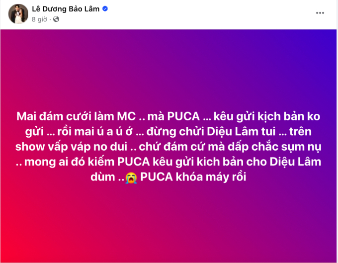 Đáng nói nhất, Lê Dương Bảo Lâm đăng đàn phàn nàn cô dâu Puka khiến cư dân mạng thi nhau thả "Haha". Mọi chuyện xuất phát từ việc Lê Dương Bảo Lâm sẽ đảm nhận vai trò MC nhưng đám cưới cận kề mà anh vẫn chưa nhận được kịch bản để luyện tập trước.
