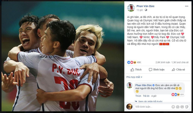 Phan Văn Đức, cầu thủ đến từ Nghệ An lại có những chia sẻ đậm chất Nghệ: "Ai ghi bàn, ai đá chính, ai dự bị có lẹ nỏ (có lẽ không - NV) quan trọng. Quan trọng là Olympic Việt Nam giành chiến thắng và tạo nên cột mốc lịch sử ở đấu trường ASIAD. Quan trọng là người dân Việt Nam, trong đó có các thầy, bố mẹ, anh chị, người thân, bạn bè của Đức cọt được hưởng trọn niềm vui từ bóng đá. Vô đến đây rồi có chi mà sợ hè (Vào đến đây rồi có gì mà sợ nhỉ? - NV). Cổ vũ cho Đ và đồng đội nhá mọi người!