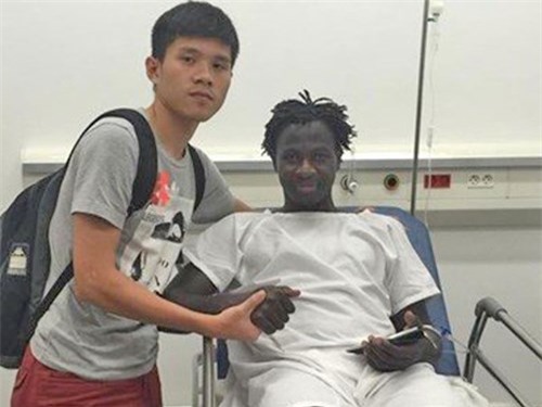 Hậu vệ Thanh Hào của HN T&T (trái) thăm cầu thủ Abbass bị gãy chân