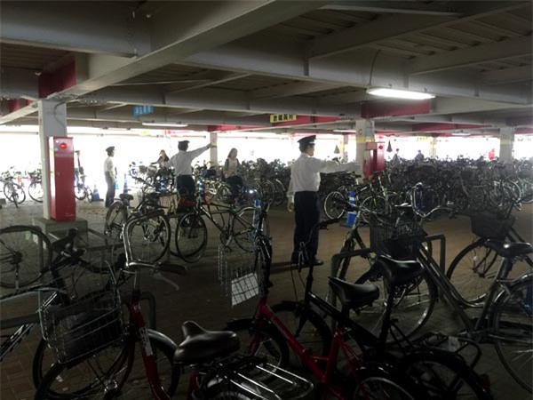 Bảo vệ trường lịch sự đứng thành hàng để chỉ dẫn chỗ để xe đạp cho sinh viên trong bãi gửi xe. Câu họ luôn nói là: "Xin mời" |