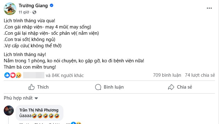 Dòng chia sẻ của Trường Giang lập tức hút hơn 84 nghìn lượt tương tác. Ông xã Nhã Phương tiết lộ tình trạng sức khỏe các thành viên trong gia đình trong 1 tháng qua liên tục phải vào bệnh viện. Trong đó, con gái 2 lần nhập viện, con trai sốt. Đặc biệt, Nhã Phương đang mang bầu ở tháng thứ 6 cũng phải cấp cứu khiến dân tình không khỏi lo lắng.